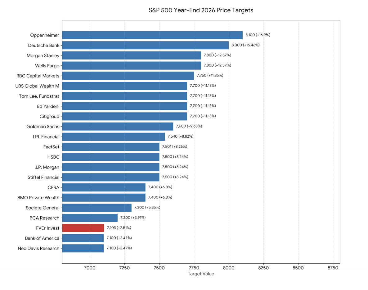 At the end of every year, the major investment houses release a year end target for the subsequent year for the S&P 500 Index. We added the FVEr Invest price target to this compilation of price targets, which was aggregated in the below linked article by Yahoo Finance, but we changed the start date to the close on December 26, 2025 which was the last Friday that the FVE model ran in 2025: