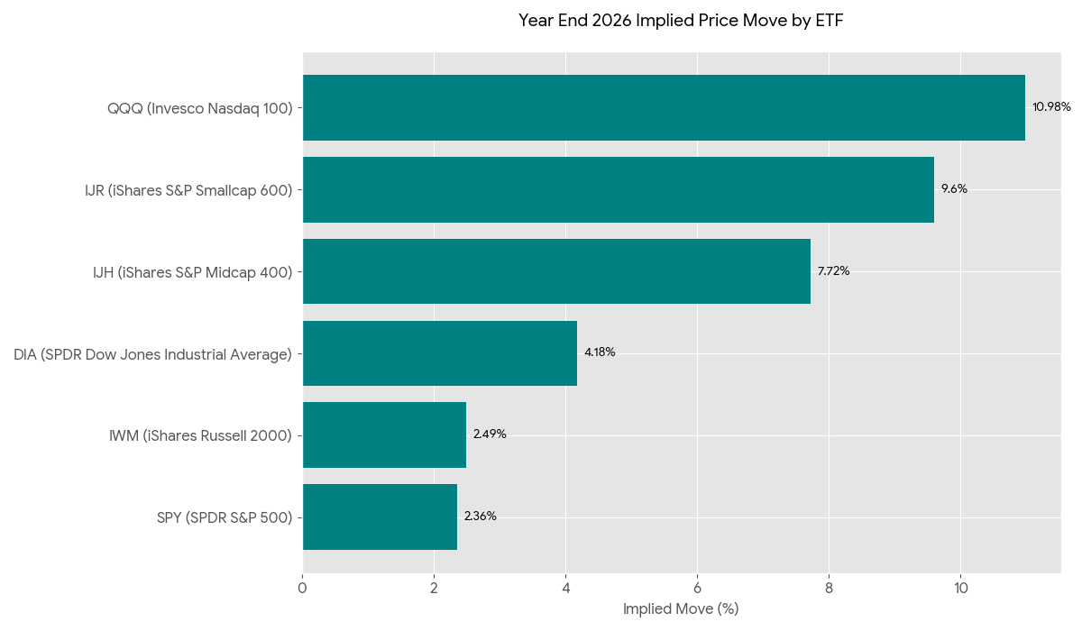 The QQQ Nasdaq 100 is leading the way with an implied move of around 11% in 2026. Part of this is because our algorithm dynamically changes its future growth rate based on recent year performance, which has been stellar for the technology focused QQQ, and also because performance of the QQQ has leveled off for the last few months, which leads to more potential upside in the future.
