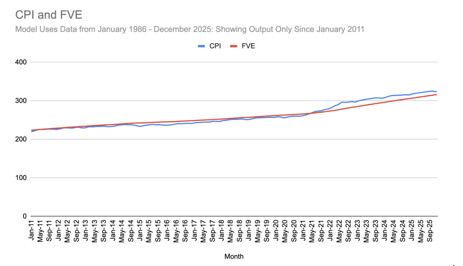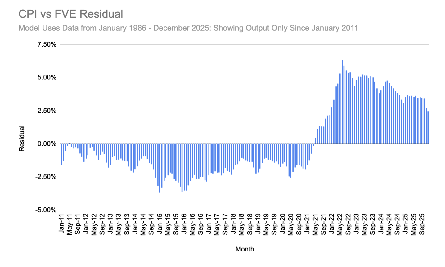The CPI is one of the most natural exponential growth phenomena in the world around us. Part of this is engineered by consistent and reliable Federal Reserve policy, and some of this is likely due to inherent axiomatic features of economics. Indeed, tracking the CPI is something our FVE algorithm is well positioned to do, and we can determine where inflation should be based on many years of CPI data.